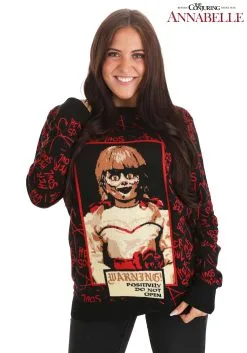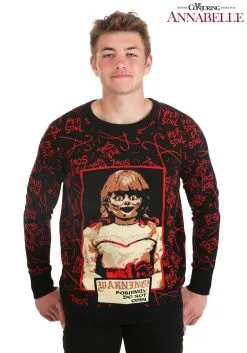 This Annabelle Ugly Sweater is part of our exclusive line of ugly sweaters inspired by horror films. The sweater is the perfect combination of comfy and creep. It has a knit-in design of Annabelle from The Conjuring Universe on the front. It also has “Her Soul” knit into an all-over print on the sleeves and on the back of the sweater. Just pair them up with some jeans for a look that’s absolutely haunting.