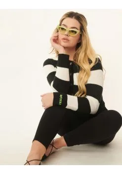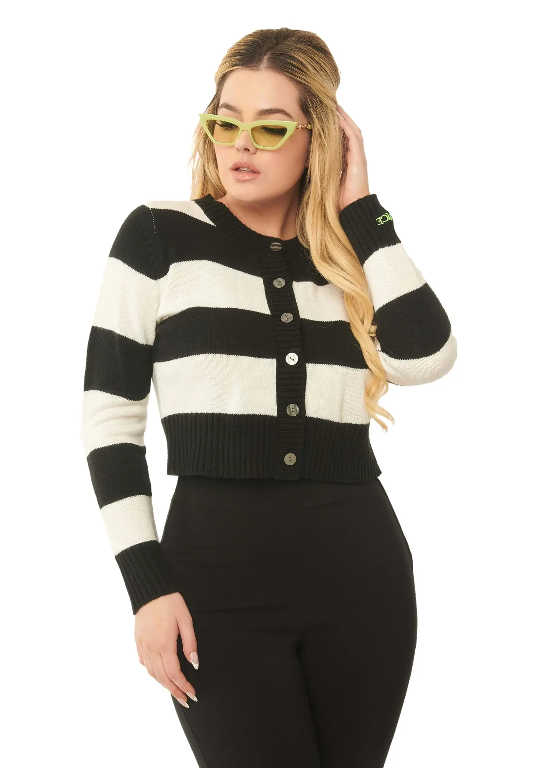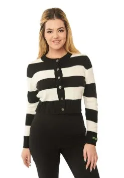 Channel your inner Lydia Deetz when you add this officially licensed cardigan to your collection! The sweater features a bold black and white horizontal stripe pattern. The cuffs, button panel, and waistline have a thick rib knit, giving the cropped fit cardi a refined look.
