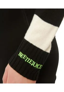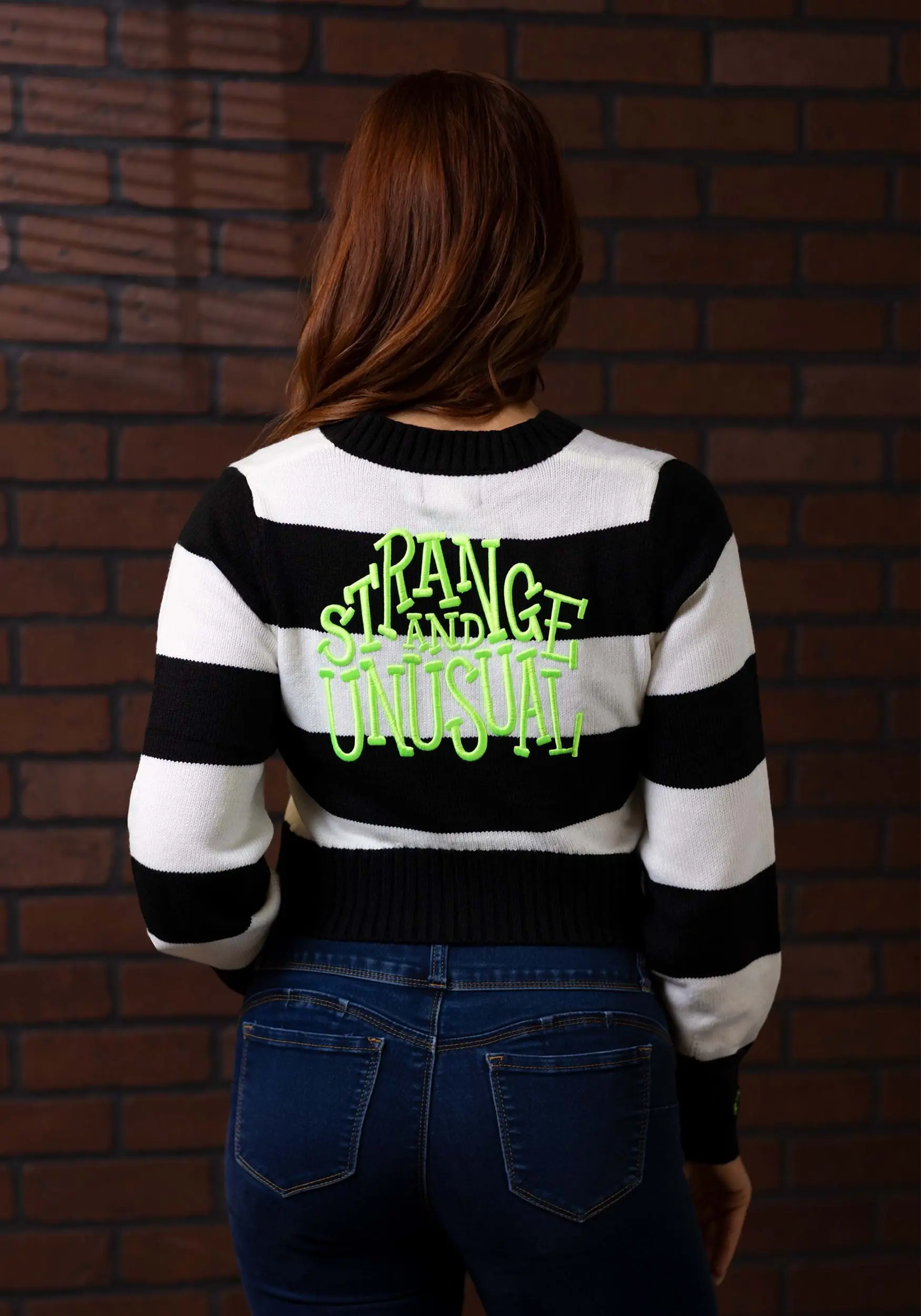 Knowing that standing out and holding an audience requires a delicate balance of intrigue and comfort, you’ve come to us—a clever choice. Our unique selection of apparel is ready to turn every wardrobe into a fascinating fashion statement no one can ignore! And we think this Beetlejuice x Unique Vintage Strange and Unusual Striped Cardigan is the perfect piece to get you started!
