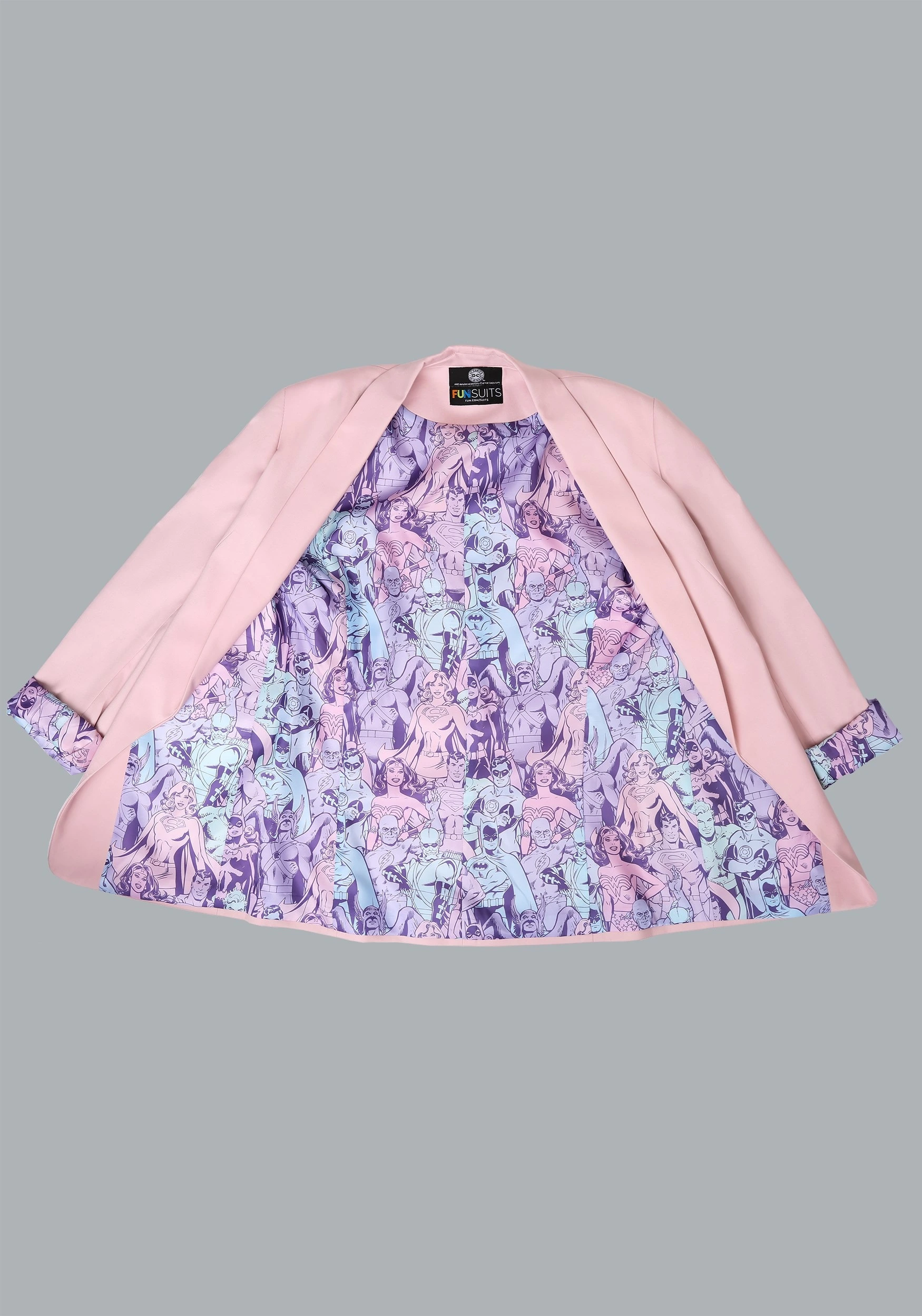 Featuring a chic shawl collar, classic flap pockets, and a custom print lining, this FUNwear blazer is a must-have wardrobe staple for fashionistas with a fondness for the powerful women of DC Comics. The subtly loose fit achieves a relaxed silhouette to make you look cool and feel powerful no matter what the day throws at you. Go ahead bad guys, take your best shot.