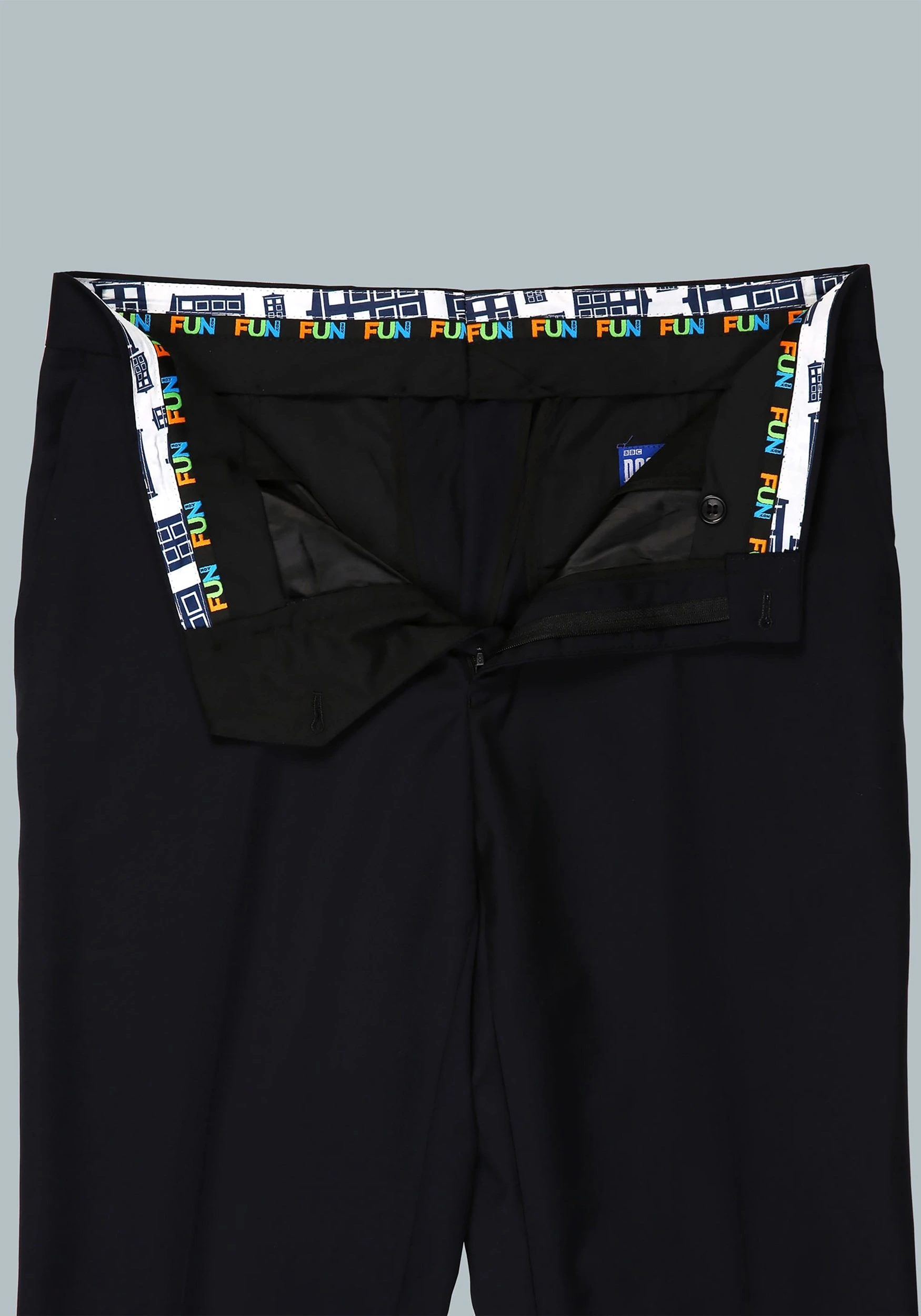 The TARDIS uses a chameleon circuit to shape its outer appearance. Humans must use fashion to sculpt their style and these TARDIS Subtle Pants will transform your look with the help of The Doctor’s signature time traveling vessel. The Doctor Who inspired pants are designed to match the coordinating TARDIS Subtle Suit Jacket and are sold separately for your convenience so you can select the perfect size to match your jacket. It has a zip fly and hook-and-bar closure for a comfortable fit, while the hemmed inseam creates a fitted look. The pants might not be able to take you to the past like the real TARDIS, but they will help you gain a style that defies time itself.