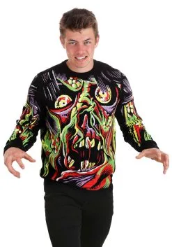 This Face the Monster Halloween Ugly Sweater is part of our line of Halloween ugly sweaters and it might be the most grotesque one we’ve ever created. That’s exactly what we were going for! The comfy sweater has a knit-in design that captures the essence of undead horror monsters. One part Frankenstein’s monster and one part zombie, it comes together in a bubbling mix of reds, greens, and yellows. The knit style makes it a comfortable sweater to wear on those cool Halloween nights, but it’s also a great option when you want to bring the legend of the hideous monster back to life!