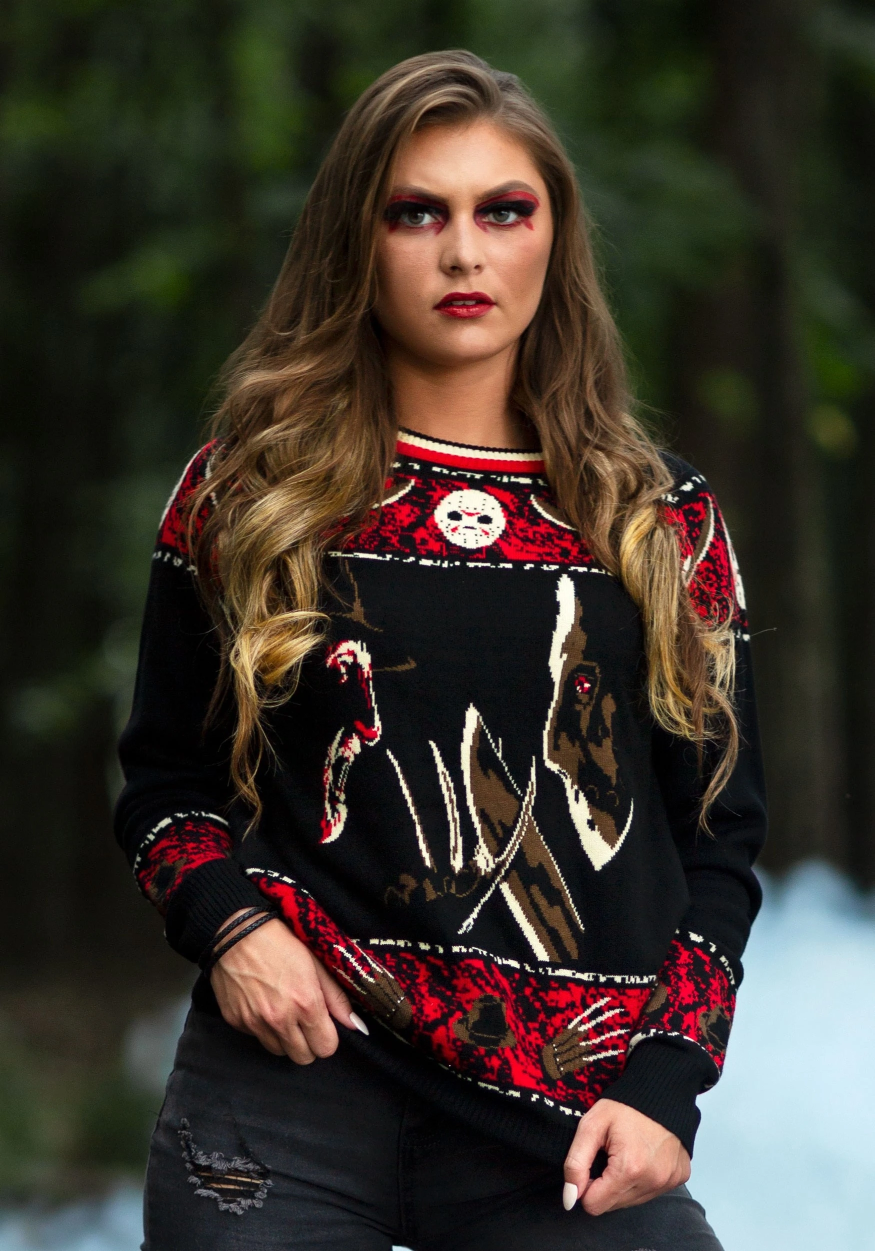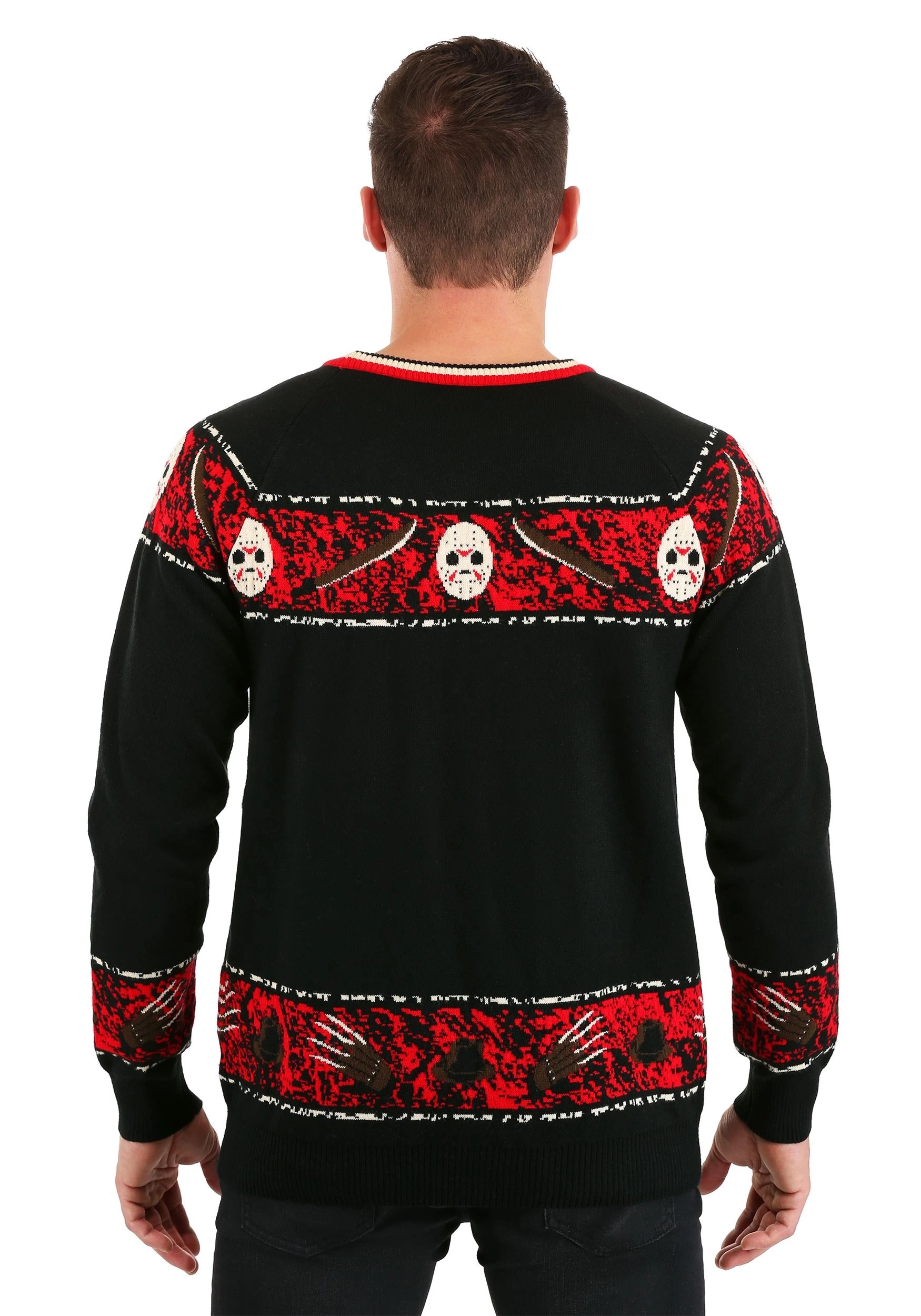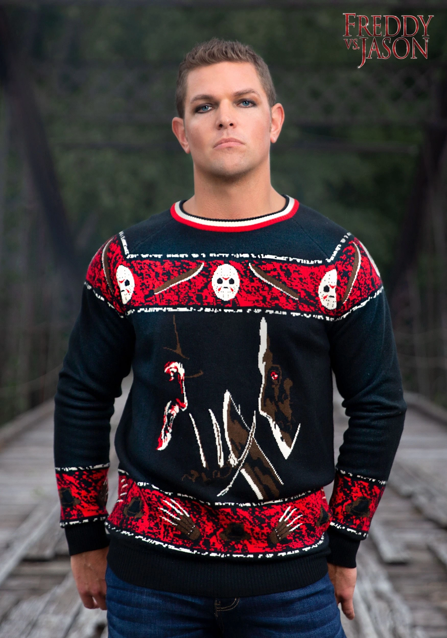 Some people just can’t get along. No matter how much they try, they’ll never be able to make nice with each other. Take Freddy and Jason for instance. They have a few things in common. They’re both horror movie villains, they both like terrorizing teens, and they both have a thirst for blood that can never be quenched, and yet… put those two in a room together and they’ll be at each other’s throats. Literally. And take a look at this sweater! Those two horror villains are about to tear each other apart once again! Will the madness ever end?
