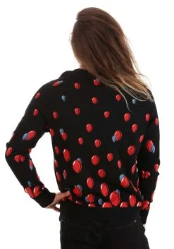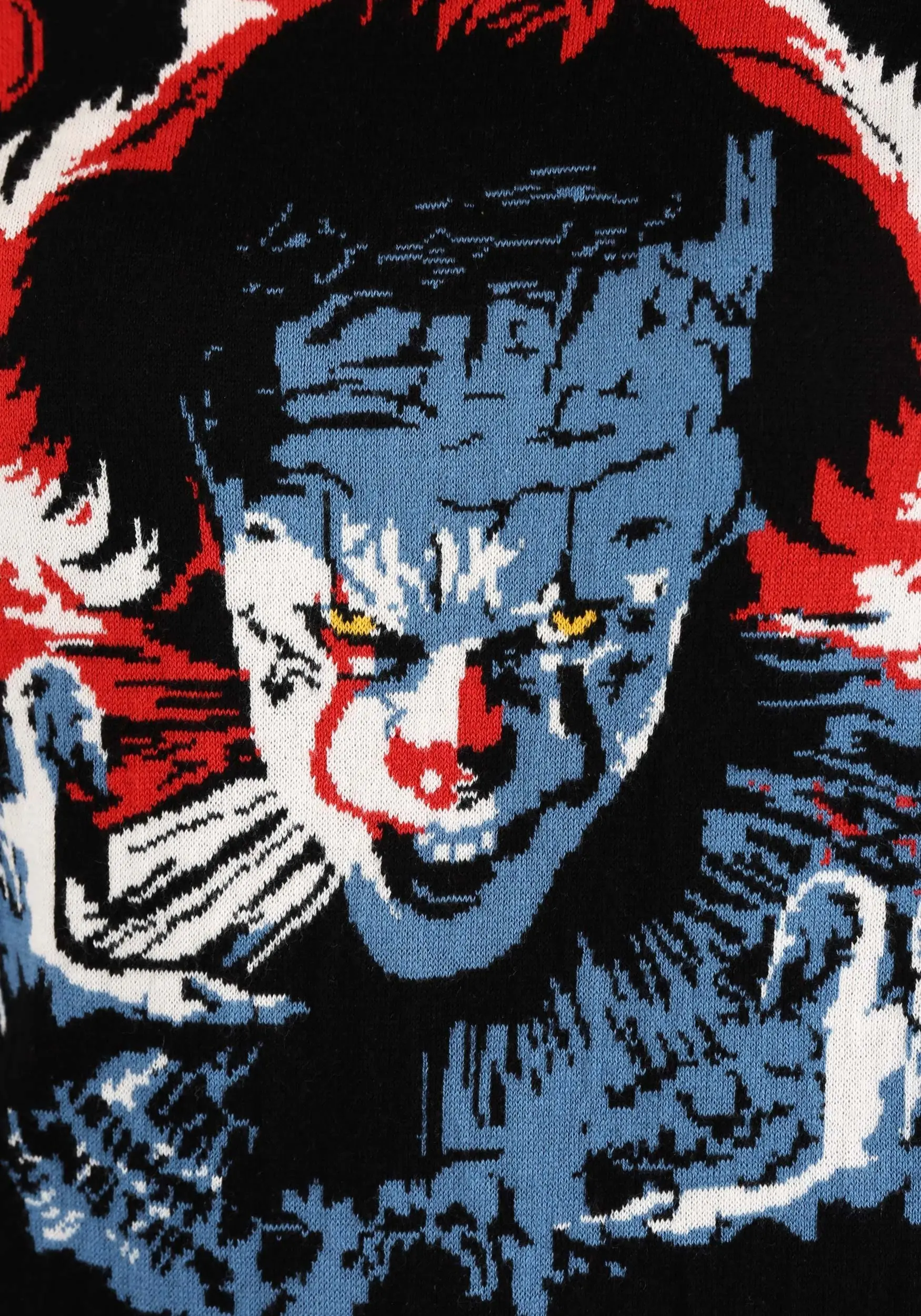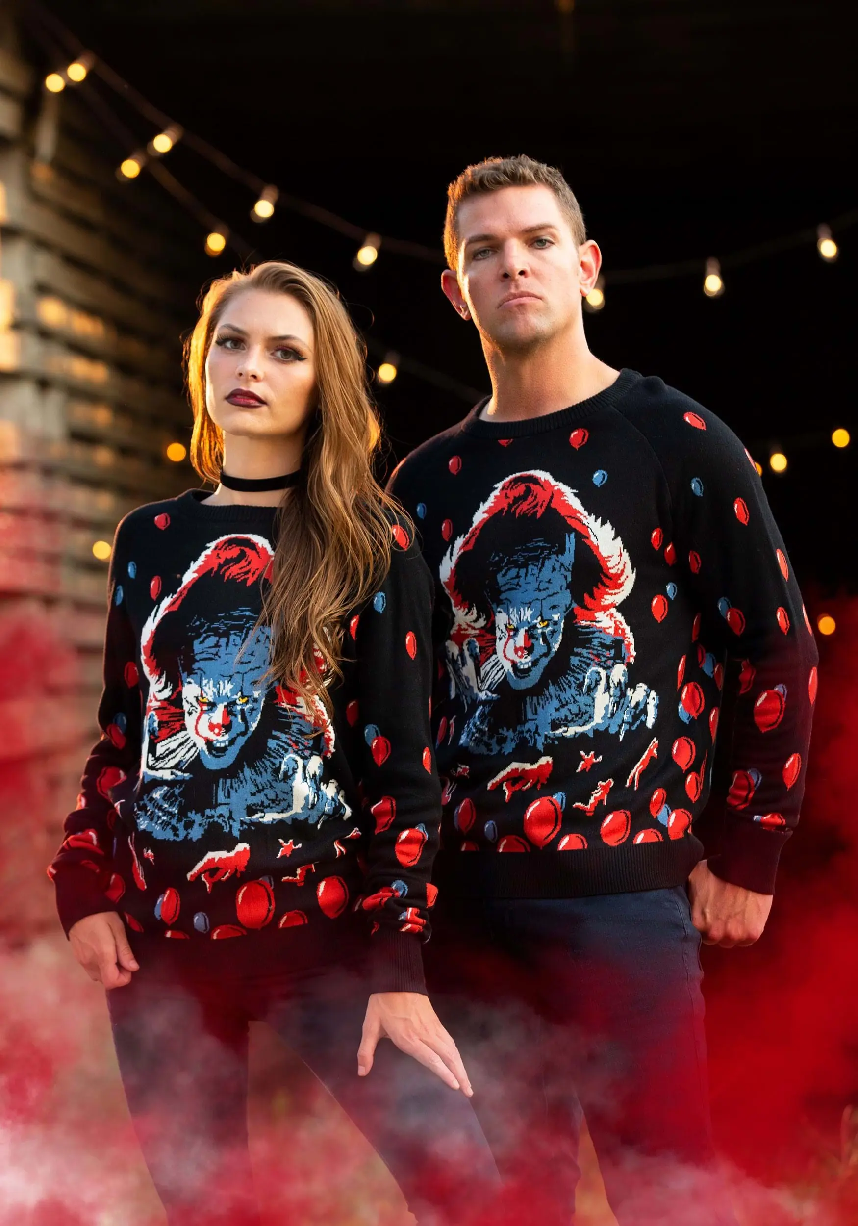 This officially licensed sweater is just one of our many horror-themed ugly sweaters. It has a knit design, with rib-knit cuffs to help create a comfy fit that’s perfect for chilly days. The front of the sweater brings you Pennywise the Dancing Clown on the front and he’s sporting that devious smile on his face, like he’s about to show you your worst fears! The sleeves and back of the sweater all have red balloons all over them… but they definitely don’t have a “happy” kind of vibe going for them. Just toss it on with your favorite pair of jeans and you’ll be ready to head out to terrify!
