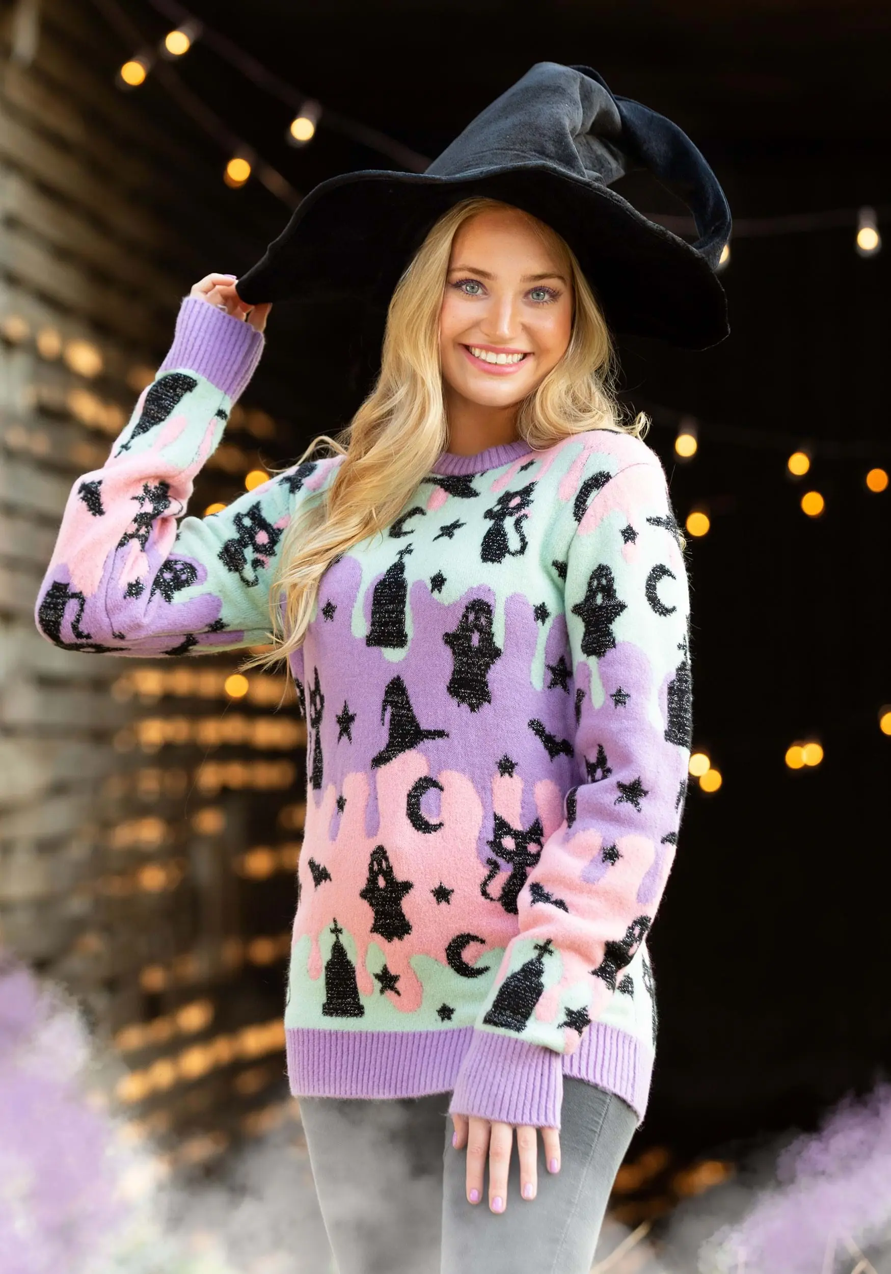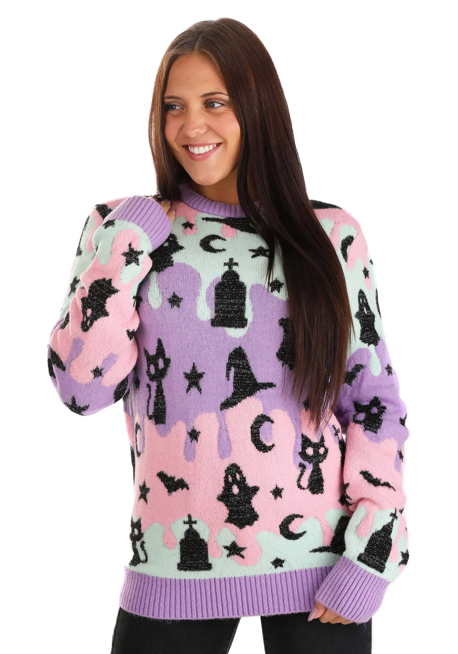 This Pastel Ugly Halloween Sweater brings you all of the Halloween classics in an absolutely adorable new color palette. The sweater is part of our line of ugly Halloween sweaters and comes with pastel purples, pinks, and turquoise colors splashed throughout it. It mixes in the usual suspects of Halloween, like witch hats, ghosts, black cats, and more to combine for a look that’s iconic, yet with an out-of-the-box sort of design. The knit also has rib-knit cuffs and a waistband to create a snug and cozy fit. It’s a great way to break from the norm this Halloween season!