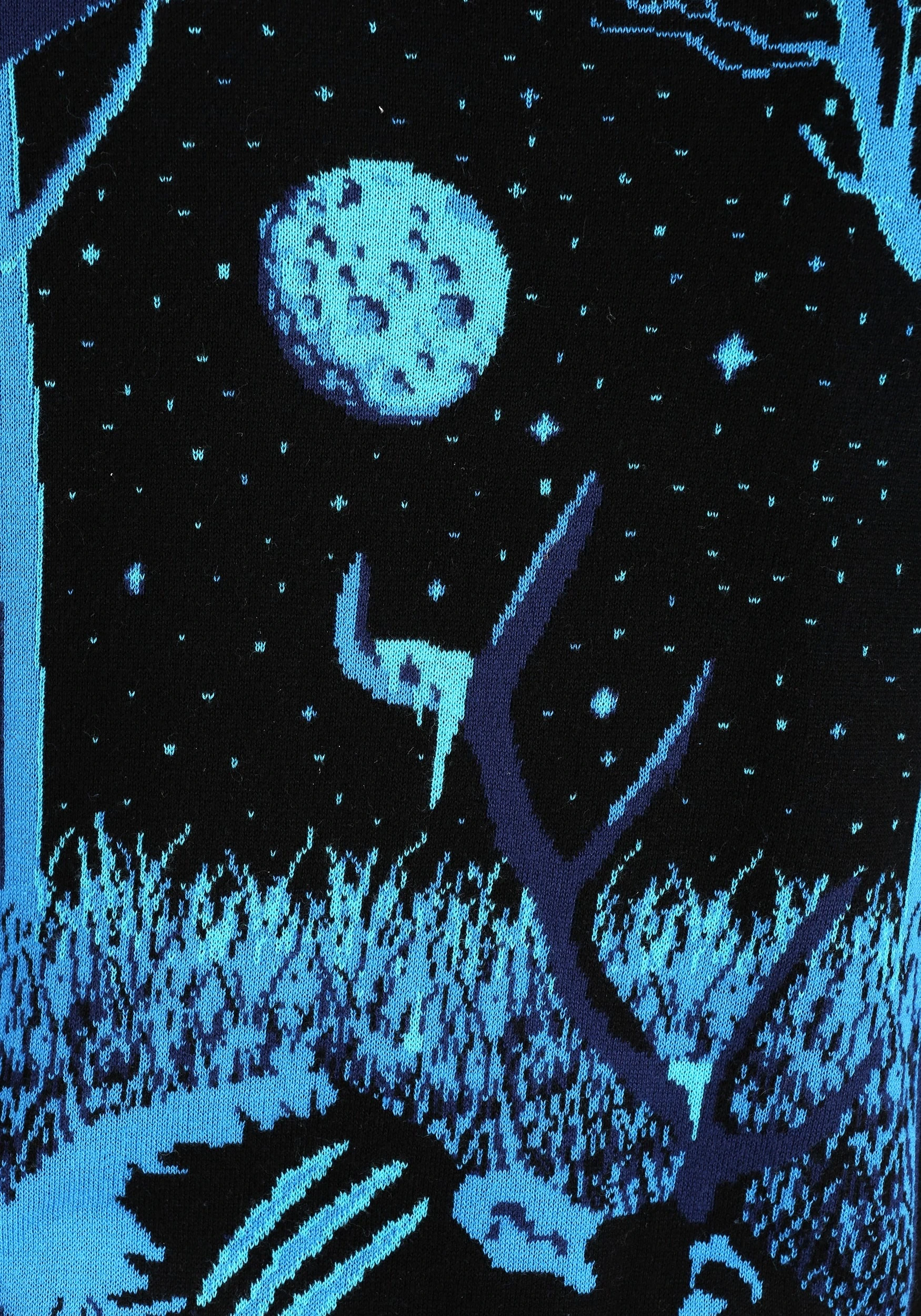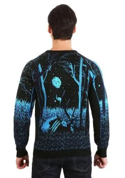 When you wear this Ugly Halloween Sweater, your transformation will be complete! The exclusive design brings you a knit-in image of a ferocious wolfman, hunting under the moonlit skies in brilliant blue tones. The cotton and acrylic blend makes this sweater a comfortable option for chilly, autumn weather, while the classic monster theme gets you in the mood for any Halloween happenings this year. The rib-knit cuffs, waistband, and neck help give this sweater a warm and snug fit. If you feel like skipping the costume this year or you just want to add some supernatural style to your wardrobe, then this Werewolf sweater may just have you howling.