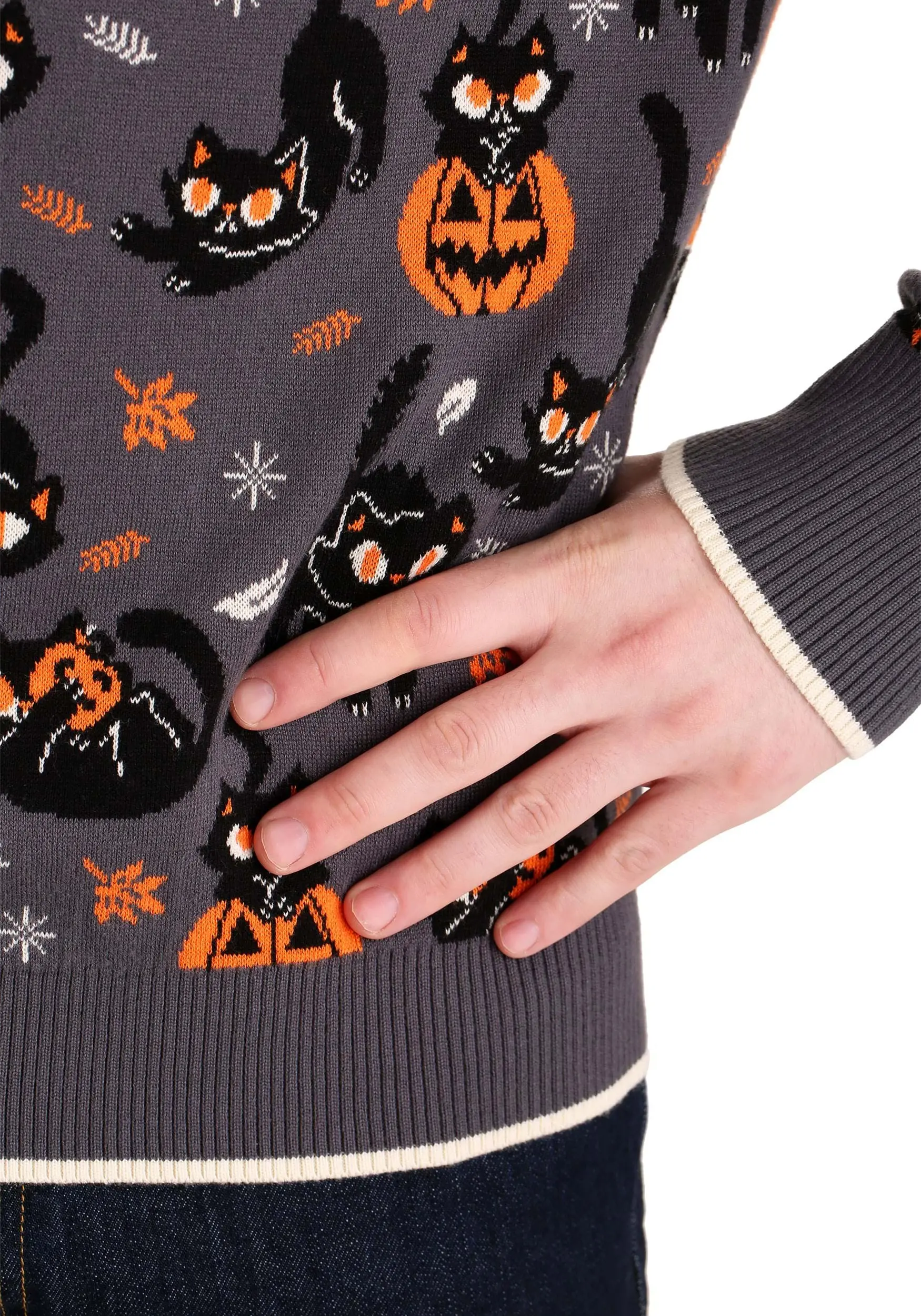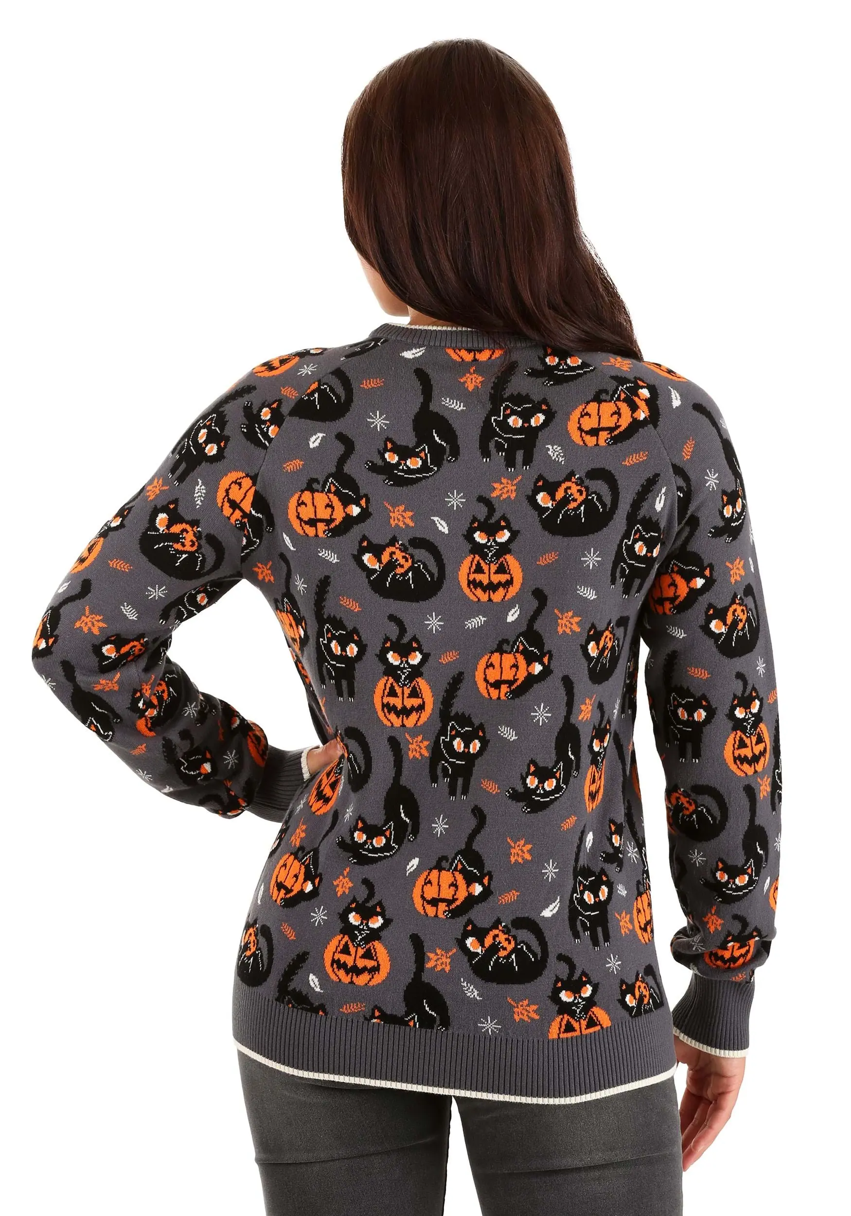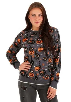 It’s just two friends waiting for the greatest night of the year! This Quirky Kitty Halloween Sweater captures the mischievous energy of those who lie in wait for Halloween. This exclusive sweater was designed by one of our crafty costume designers, so it has various designs of kitties, pumpkins, and hi-jinks. It’s festive fall wear that you can throw on in lieu of a costume. The sweater is made from a cotton and acrylic blend, which also makes it a cozy choice for those chilly autumn days. If you’re looking for something a little more subtle this year then this sweater is an easy… and comfy choice!